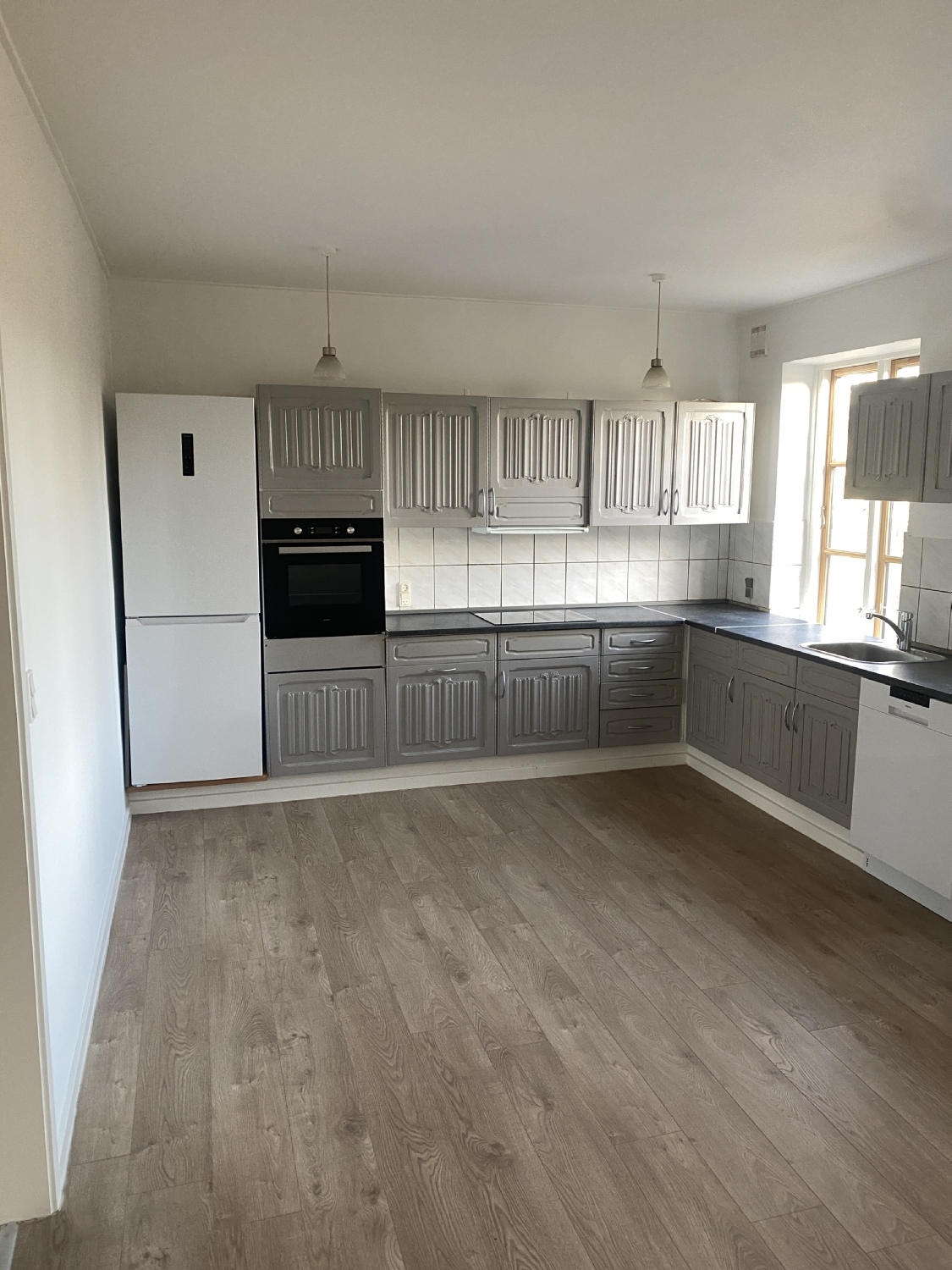 Køleskab, komfur og emhætte.